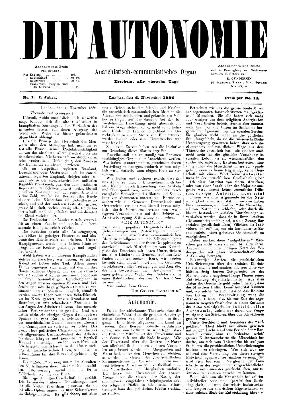 Die anarchistische Zeitung »Die Autonomie« (London) war eines der wichtigsten, im Ausland erschienenen Organe, welches nach Österreich eingeschmuggelt wurde. Zunächst prägte die Zeitung wesentlich die radicale Arbeiterbewegung in Österreich, wurde dann hier das führende Organ der anarchistischen Bewegung der Autonomisten und bereitete auch die anarchistische Bewegung der Unabhängigen Socialisten in Österreich vor.