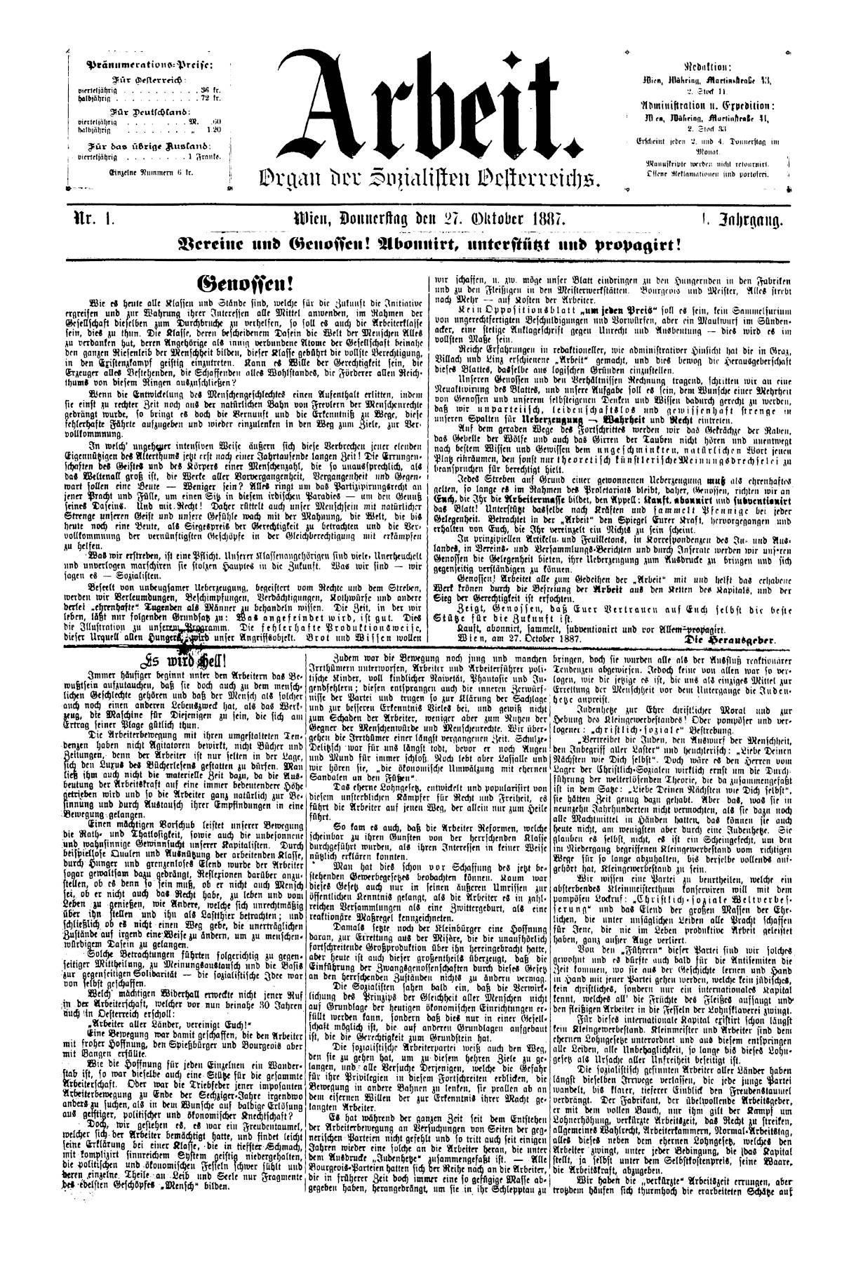 Die anarchistische Zeitung »Arbeit« (Wien) war ein wichtiges Organ der Autonomisten innerhalb der radicalen Arbeiterbewegung in Österreich. Sie war gleichsam Nachfolgerin der vollständig beschlagnahmten und nicht erschienenen Nummer der in Linz an der Donau (Oberösterreich) gedruckten Zeitung »Arbeit« (Linz) vom 6. Oktober 1887. Begonnen wurde die Zeitung als »Die Arbeit« (Marburg, dann Graz), erschienen vom 6. August 1885 bis 16. April 1886, fortgesetzt als »Arbeit«(Villach), erschienen vom 3. bis 16. Juni 1887, und als »Arbeit« (Linz) vom 6. Oktober 1887. Mit der »Arbeit« (Wien), erschienen vom 27. Oktober bis 22. Dezember 1887, fand die »Arbeit« als letztes Organ der radicalen Arbeiterbewegung in Österreich ihr Ende. Grund waren weniger die durch die zahlreichen Konfiskationen entstandenen finanziellen Probleme, sondern das Verbot aufgrund der Ausnahmsbestimmungen.