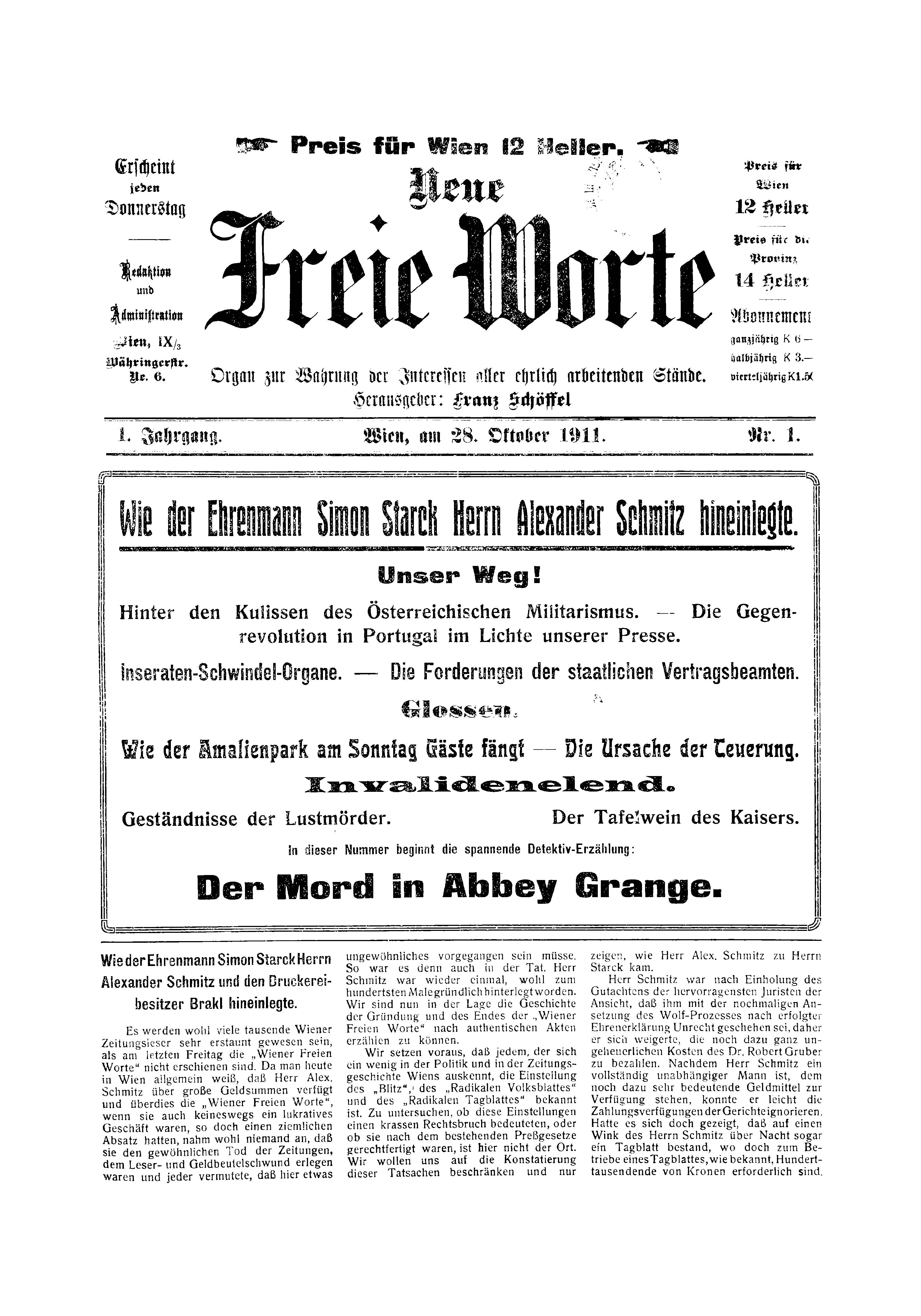 - *Schöffel, Franz [Vinzenz]: (F. Sch.) Ein staatsgefährlicher Verein in Wien, in: 1/2/3 (2.11.1911); (F. Sch.) Der Papst und die Italiener in Tripolis, in: 1/4/2–3 (16.11.1911); (F. Sch.) Bettelkomödianten. Louis Treumann und Pepi Glöckner-Kramer, in: 1/10/4 (28.12.1911); (anonym; mit Bela Krausz) Intimes aus einer Advokaturskanzlei, in: 2/11/3–4 (4.1.1912; über Emil Frischauer); Soweit sind wir in Oesterreich noch nicht, in: 2/13/3–4 (18.1.1912) (F. Sch.) Der Schrecken der Prostitution, in: 2/13/4 (18.1.1912); Abenteuer einer züchtigen Hausfrau, in: 2/14/5–6 (25.1.1912); (F. Sch.) Die neue Totalisateur- und Buchmachersteuer. Die feile Tagespresse, in: 2/15/4 (1.2.1912); (anonym; mit Bela (Bernhard) Krausz) Ein allmächtiger Advokat, in: 2/16/3 (8.2.1912; über Emil Frischauer); (anonym; mit Paul Dupont und Julius Schiffer) Die Gefahren des Kinotheaters für die Volksmoral, in: 2/16/5–6 (8.2.1912); (anonym; mit Franz Frank und Michael Ebner) Und nochmals die Schmutzkonkurrenz der Militärkapellen und die Zivilmusiker, in: 2/17/2 (15.2.1912); (anonym; mit Julius Picke) Die »Versorgung« der längerdienenden Unteroffiziere. Offener Brief eines Feldwebels an den Kriegsminister, in: 2/21/2–3 (14.3.1912); (anonym; mit Friedrich Schnepp) Und nochmals die Schmutzkonkurrenz der Militärkapellen und die Zivilmusiker, in: 2/22/3–4 (21.3.1912); (anonym; mit Alois Moißl) Die Geschäfte des Kandidaten Moißl, in: 2/25/3–4 (11.4.1912; Abdruck);(anonym; mit Alois Moißll) Wir und die Arbeiterzeitung, in: 2/25/4 (11.4.1912; Abdruck); Glossen. »Schon aber weht der Atem des Frühlings…« [/] Seehund, Pinguin Fischmensch und Grubenhund, in: 2/25/6–6 [recte 7] (11.4.1912); (anonym) Vor der großen Komödie. Christlichsoziale, Freiheitliche und Sozi, in: 2/26/1–2 (18.4.1912); (anonym) Gemeinderatswahlen, in: 2/27/1–2 (25.4.1912); (anonym; mit Heinrich Nowatschek) Vermittelt der »Neue Wiener General-Anzeiger« tatsächlich den Verkauf von Objekten, in: 2/32/3–4 (30.5.1912); (anonym; mit Rudolf Handt) Erpresser und Buchmacher, in: 2/38/2 (12.7.1912); Moloch Kapitalismus. Bete und arbeite!, in: 2/41/1–2 (2.8.1912), (anonym; mit Franz Wolf, Alfred Engel und Samuel Bojnitzer) Der Wahlschwindel der Sozialdemokraten in der Leopoldstadt, in: 2/43/2–3 (16.8.1912); (anonym; mit Franz Josef Fritsch) Vizebürgermeister Dr. [Josef] Porzers Flucht vor dem Schwurgericht. Seine Zuflucht beim Bezirksgericht, in: 2/43/4 (16.8.1912); (anonym; mit Karl Panesch) Eine Berichtigungsklage Dr. Paneschs contra Dr. med. [Heinrich] Grün, in: 2/59/3 (6.12.1912); Glossen, in: 2/59/3 (6.12.1912); Alt-Serbien und die albanische Frage. Eine Polemik, in: 2/62/3 (27.12.1912); (anonym; mit anderen) »Neue Freie Worte« und ihre Leser. Ein statistischer Versuch, in: 3/2/2–3 (10.1.1913); Glossen, in: 3/7/3–4 (14.2.1913); (anonym; mit Hermann von Gilm zu Rosenegg) Aus der Weltgeschichte des Neuen Wiener Journals, in: 3/9/7 (28.2.1913); (anonym; mit Johann Welebil) Und was ist das für eine Schweinerei. Wie man Arbeiter behandelt, in: 3/9/9 (28.2.1913); (anonym; mit Andreas Scheu) »Unsere Zensur ist wirklich blöd!«, in: 3/9/8 (28.2.1913); Der Grubenhund und sein Herr, in: 3/16/3 (30.4.1913)